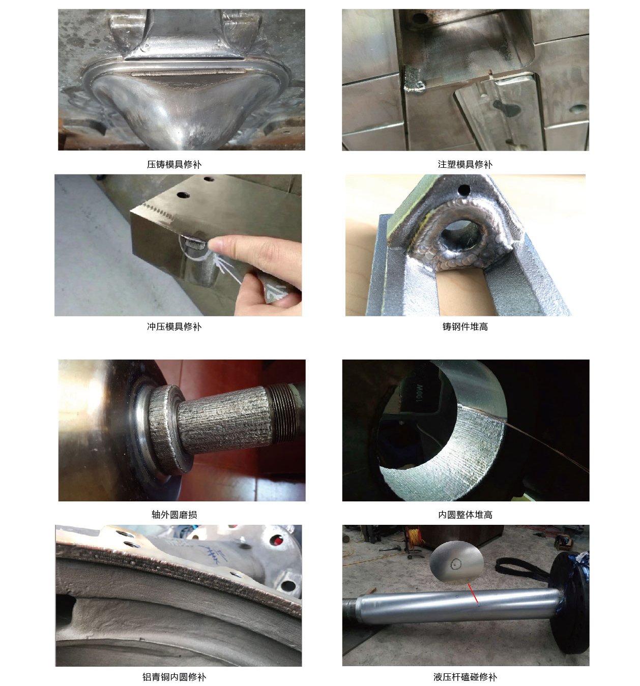 2、工零配件焊補(bǔ):各類軸類、齒類、液壓桿、油缸、機(jī)床軌道的焊補(bǔ)。