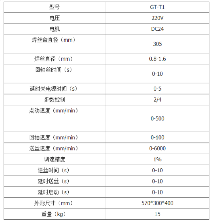 GT-T1型全數(shù)字智能送絲機(jī)是在微電腦控制下,可以根據(jù)設(shè)定的參數(shù)連續(xù)穩(wěn)定的送出焊絲的自動(dòng)化送絲裝置。是一臺(tái)通用的高效實(shí)現(xiàn)自動(dòng)填絲冷焊機(jī)、鎢極氬弧或等離子焊接的焊接輔助設(shè)備。該產(chǎn)品是由直流送絲電機(jī)及送絲機(jī)構(gòu)、電機(jī)調(diào)速板、控制變壓器及輸出繼電器、面板控制旋鈕及輸入輸出接口、焊絲盤支架等組成。焊接送絲是一個(gè)系統(tǒng)工程,送絲機(jī)須與焊接電源、專機(jī)、焊接工藝相匹配,才能進(jìn)一步提高自動(dòng)化、智能化的焊接的速度和質(zhì)量,彰顯經(jīng)濟(jì)效率。